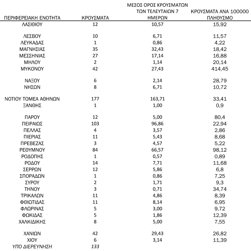 Ο ΕΟΔΥ ανακοίνωσε σήμερα 12/7 2.065 νέα κρούσματα κορονοϊού στη χώρα, με την Αττική και τη Θεσσαλονίκη να καταγράφουν τα περισσότερα περιστατικά covid-19. Παράλληλα, το Ηράκλειο και το Ρέθυμνο βρίσκονται στο «κόκκινο».