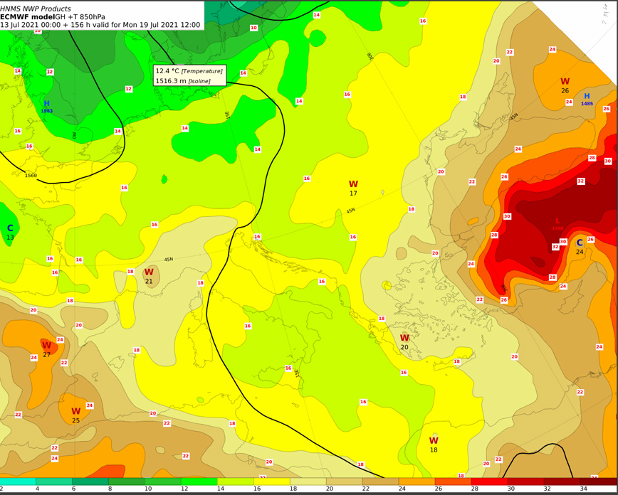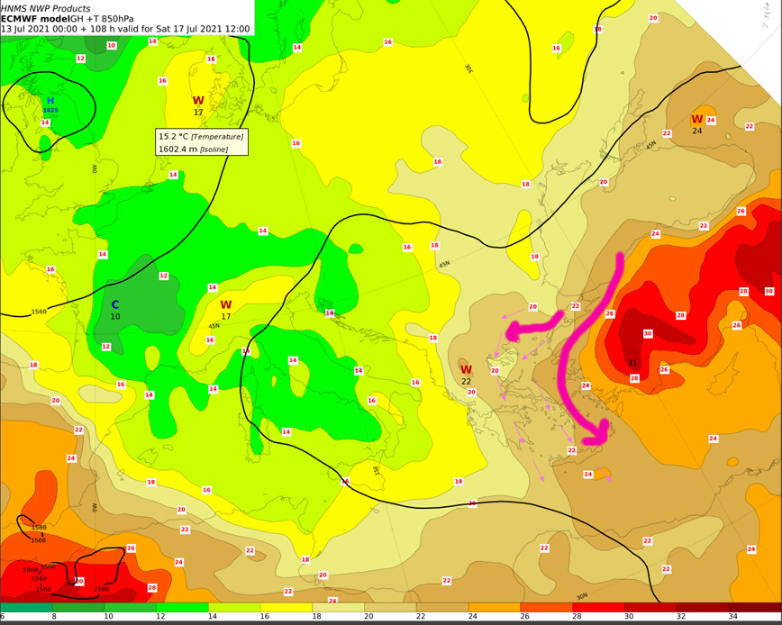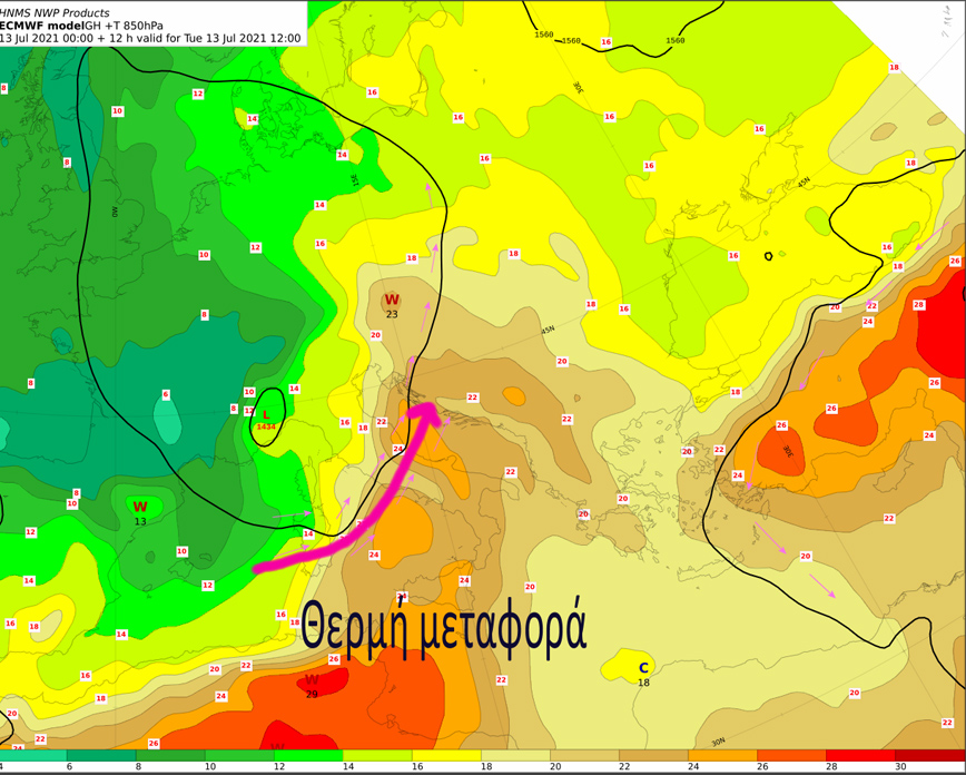 Σύμφωνα με τον Θεόδωρο Κολυδά, διευθυντή του Εθνικού Μετεωρολογικού Κέντρου ΕΜΥ, στον παρακάτω χάρτη εκτός από τις θερμές μάζες που έρχονται από την Αφρική μπορείτε να παρατηρήσετε ότι υπάρχει και άλλο θερμικό μέγιστο στο εσωτερικό της Τουρκίας. Όσο υπάρχει το μελτέμι στο Αιγαίο, αυτό το θερμικό μέγιστο δεν μας επηρεάζει, αλλά από την Πέμπτη προς την Παρασκευή που εξασθενούν οι βοριάδες υπάρχει τάση να μεταφερθεί μέρος των θερμών αερίων μαζών δυτικότερα. Πρόσκαιρα όμως.