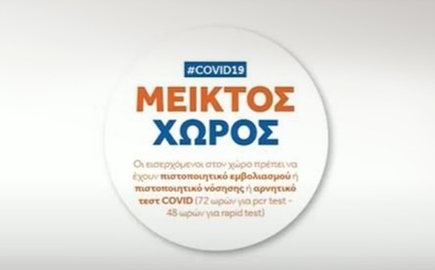 Τα σήματα αυτά θα τοποθετούν σε εμφανές σημείο στις επιχειρήσεις και έτσι οι πολίτες θα ενημερώνονται για το αν ο εκάστοτε χώρος είναι Covid-free ή μεικτός αλλά και αν το προσωπικό του είναι πλήρως εμβολιασμένο. Είναι τα εξής: