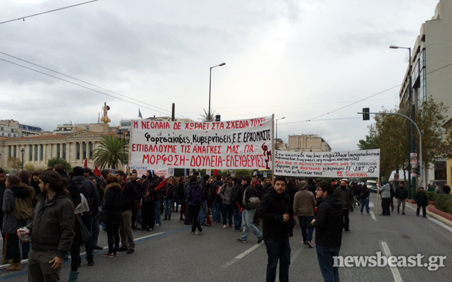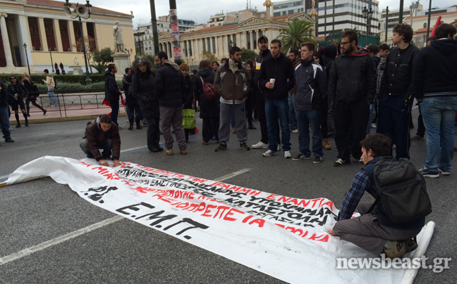 Διαμαρτυρία μπροστά από τα Προπύλαια πραγματοποιούν αυτή την ώρα φοιτητές, οι οποίοι έχουν αναρτήσει πανό που γράφει, μεταξύ άλλων: «Φορτσάκηδες, κυβερνήσεις, Ε.Ε. ερχόμαστε».