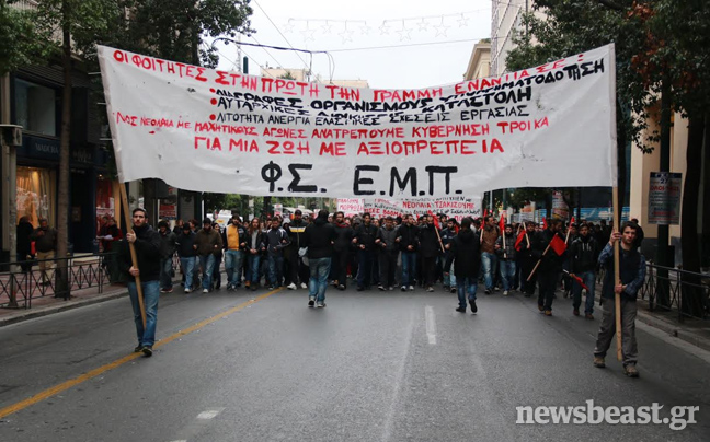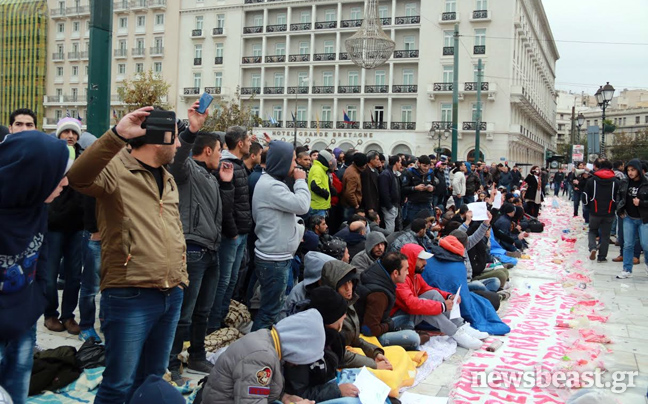 Έξω από τη Βουλή έφτασε η πορεία των φοιτητών, στο σημείο όπου επί μία εβδομάδα παραμένουν οι σύροι πρόσφυγες, διεκδικώντας στέγη και άσυλο.