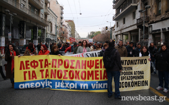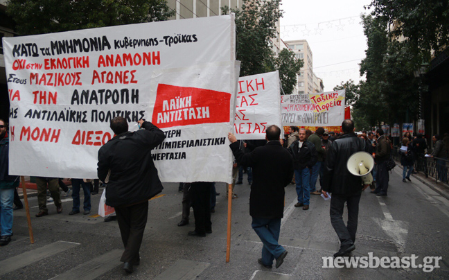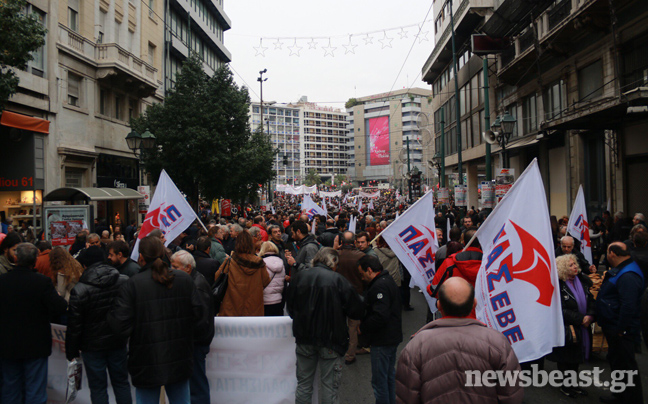 Η σημερινή απεργία έχει κηρυχτεί ενάντια στην ανεργία, τη μείωση μισθών και συντάξεων, τη διάλυση των εργασιακών σχέσεων και όλες τις εξοντωτικές πολιτικές λιτότητας.