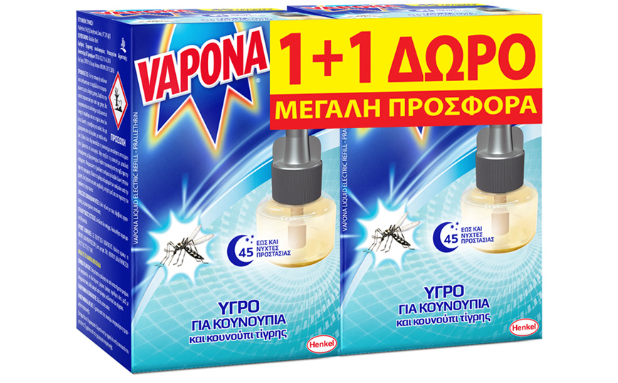 To προϊόν «πρωταγωνιστής» για την προστασία από τα κουνούπια είναι η ηλεκτρική συσκευή Vapona με ρυθμιστή έντασης και 5 σε 1 οφέλη, η οποία σε συνδυασμό με τα Vapona εντομοαπωθητικά σώματος παρέχουν πλήρη και αποτελεσματική προστασία μέσα και έξω από το σπίτι!