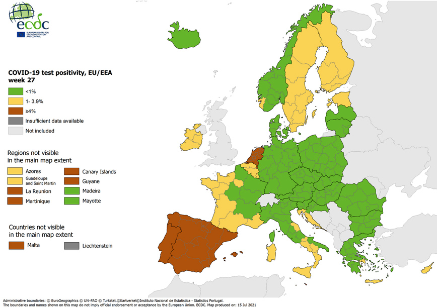 Πελοπόννησος, Δυτική Στερεά, Ήπειρος, Επτάνησα, Θεσσαλία, Δυτική Μακεδονία, Κυκλάδες και Δωδεκάνησα είναι «κίτρινα» στον χάρτη του ECDC.