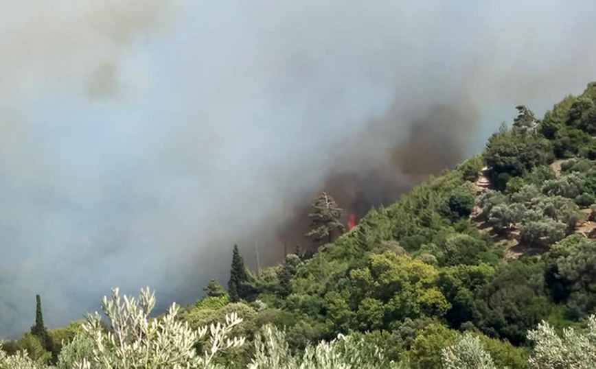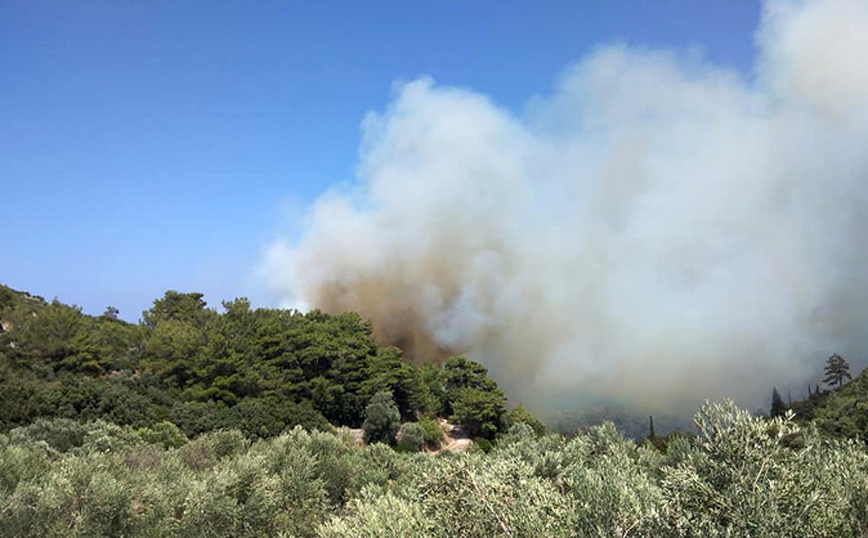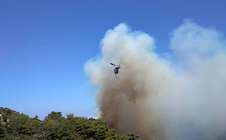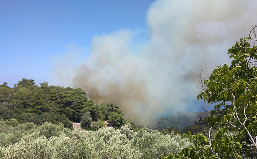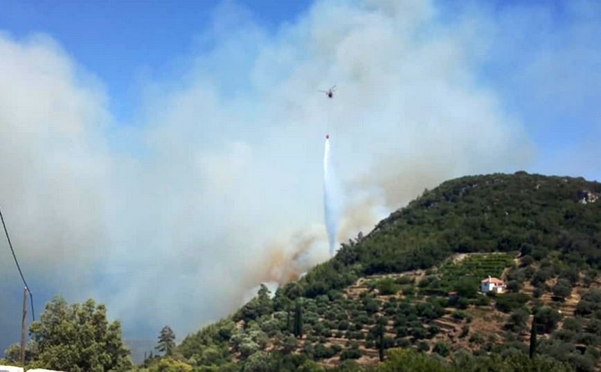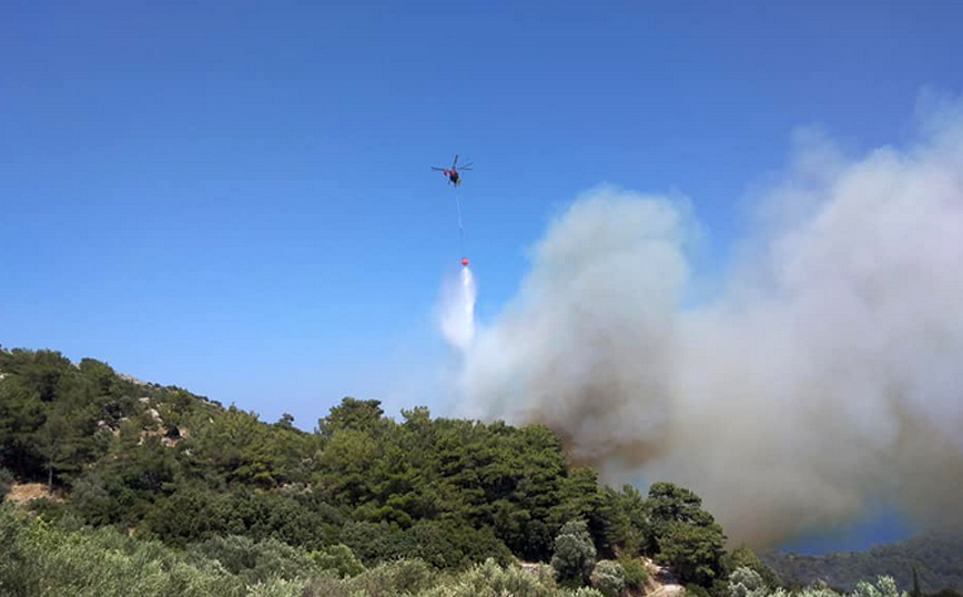 Για την κατάσβεση της φωτιάς από αέρος επιχειρούν τρία αεροσκάφη και δύο ελικόπτερα. Στο έδαφος επιχειρούν 22 πυροσβέστες με 10 οχήματα αλλά και εθελοντές με πέντε οχήματα και βυτιοφόρα των Δήμων του νησιού.