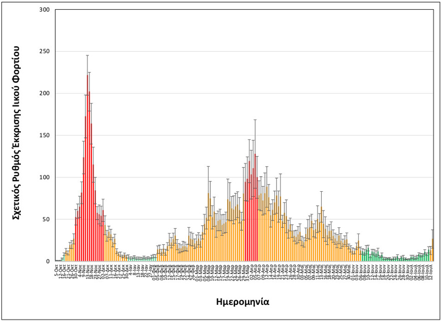 Όπως φαίνεται στα διαγράμματα που παρουσιάζει το ΑΠΕ-ΜΠΕ το ιικό φορτίο απεικονίζεται πλέον σε «πορτοκαλί» επίπεδο επιδημιολογικού συναγερμού, με την τάση από μέρα σε μέρα, σε σύγκριση με την αντίστοιχη στην έναρξη του τρίτου κύματος της πανδημίας, να αποτυπώνεται πιο έντονα αυξητική.