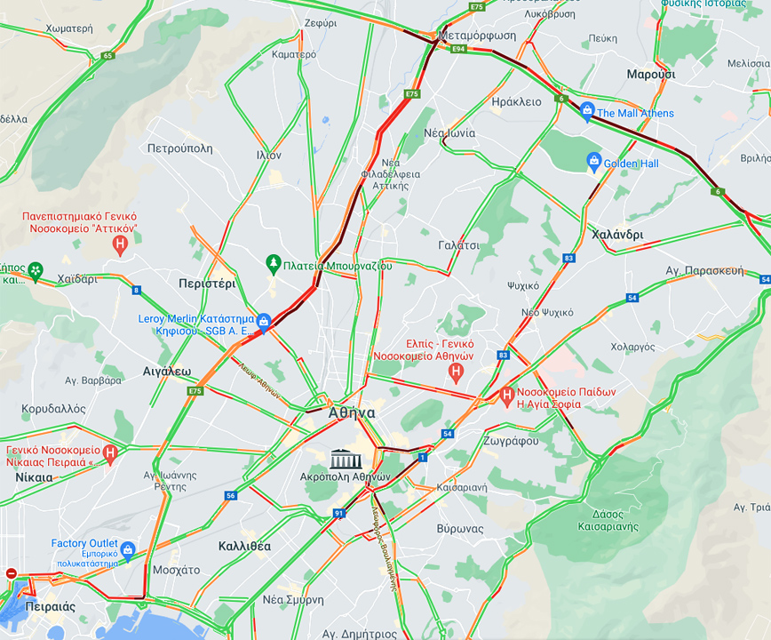 Καθυστερήσεις παρατηρούνται ακόμα και σε δρόμους του κέντρου της Αθήνας αλλά και στον Πειραιά.