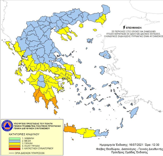 Σύμφωνα με το Χάρτη Πρόβλεψης Κινδύνου Πυρκαγιάς που εκδίδει η Γενική Γραμματεία Πολιτικής Προστασίας του Υπουργείου Προστασίας του Πολίτη (www.civilprotection.gr), για αύριο, Σάββατο 17 Ιουλίου 2021, προβλέπεται πολύ υψηλός κίνδυνος πυρκαγιάς (κατηγορία κινδύνου 4) για τις εξής περιοχές: