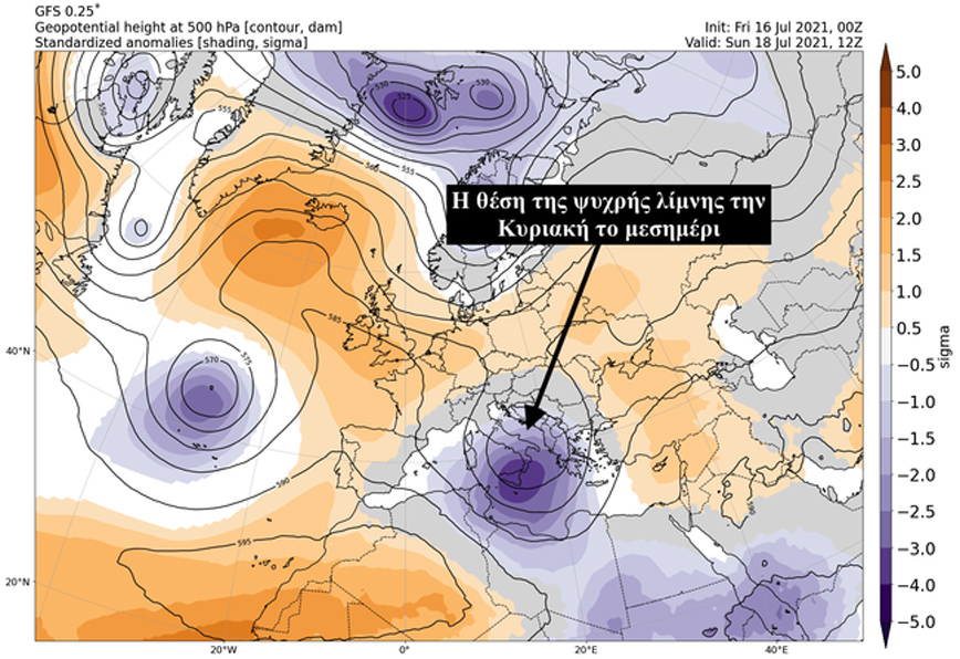 Στον παρακάτω χάρτη του Meteo βλέπετε τη θέση της ψυχρής λίμνης το μεσημέρι της Κυριακής