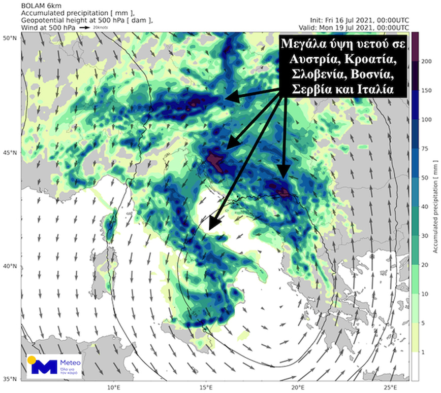 Κατά την κίνηση της αυτή – προσθέτει – η ατμοσφαιρική διαταραχή θα προκαλέσει εκτεταμένες βροχές και καταιγίδες στις ανατολικές Άλπεις (Αυστρία), στα δυτικά τμήματα της Βαλκανικής χερσονήσου (Κροατία, Σλοβενία, Βοσνία και Σερβία) και την Ιταλία όπου αναμένονται πολύ μεγάλα ύψη βροχής, όπως φαίνεται και στο ακόλουθο γράφημα: