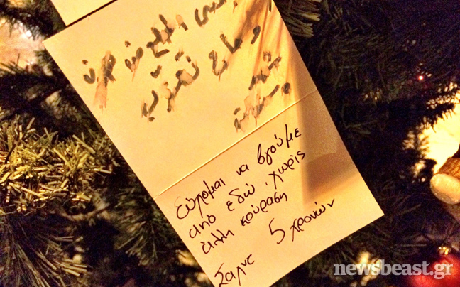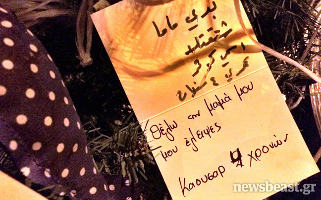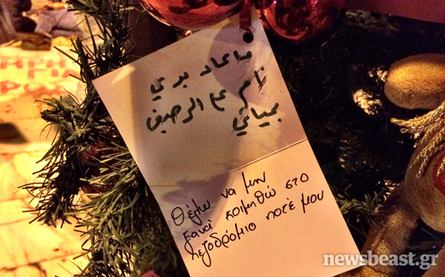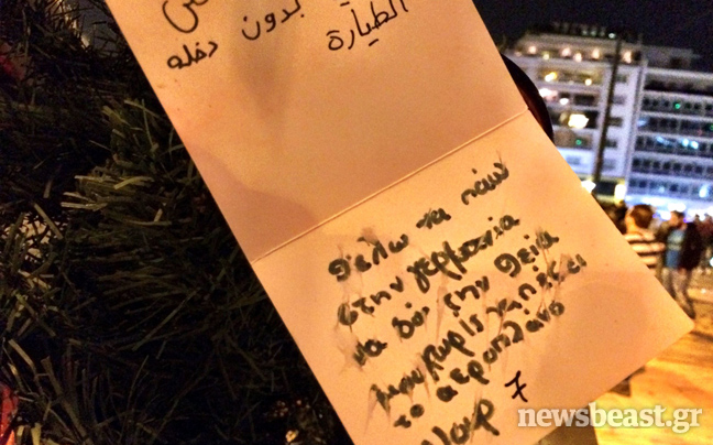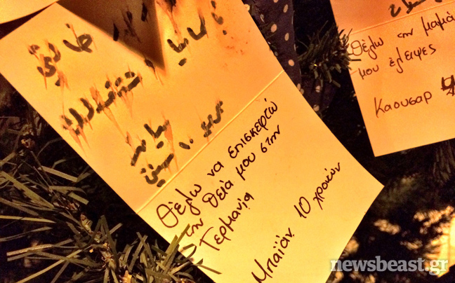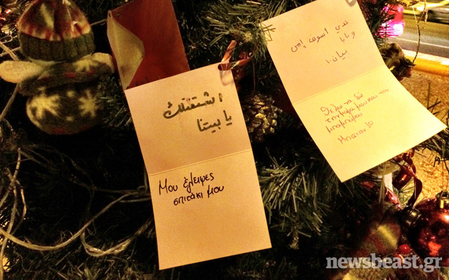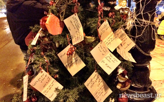 Το χριστουγεννιάτικο δέντρο που βρίσκεται πάνω στο πεζοδρόμιο της λεωφόρου Αμαλίας τραβάει τα βλέμματα των περαστικών, μιας και έχει στολιστεί με χαρτάκια πάνω στα οποία οι μικροί πρόσφυγες από τη Συρία, έχουν γράψει τις δικές τους ευχές για τη νέα χρονιά και ζητούν τα βασικά αγαθά: στέγη, φαγητό και ιατροφαρμακευτική περίθαλψη.
