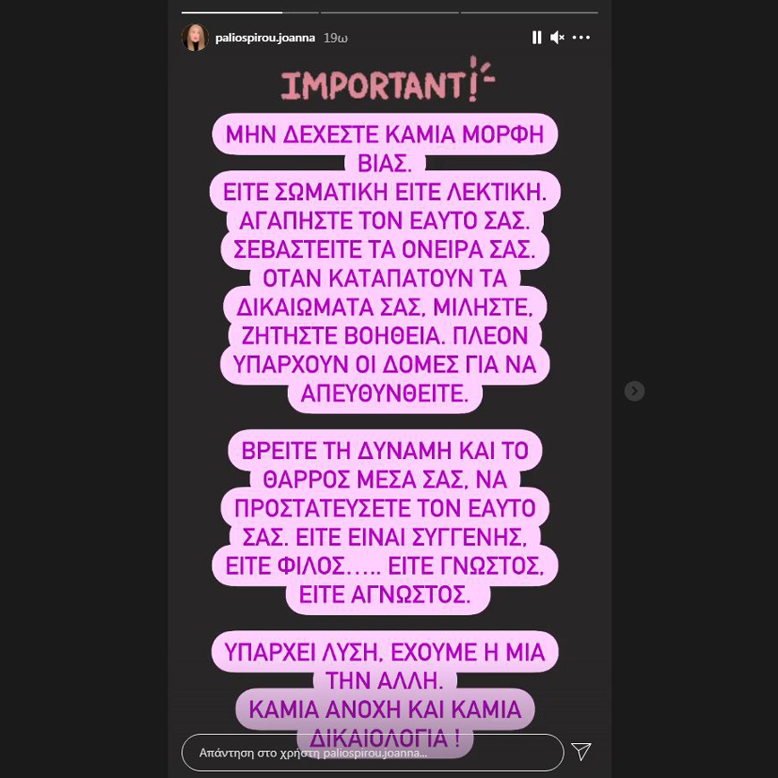 Βρείτε τη δύναμη και το θάρρος μέσα σας, να προστατεύσετε τον εαυτό σας. Είτε είναι συγγενής, είτε φίλος…είτε γνωστός, είτε άγνωστος. Υπάρχει λύση, έχουμε η μια την άλλη. Καμία ανοχή και καμία δικαιολογία!» είναι το μήνυμά της.