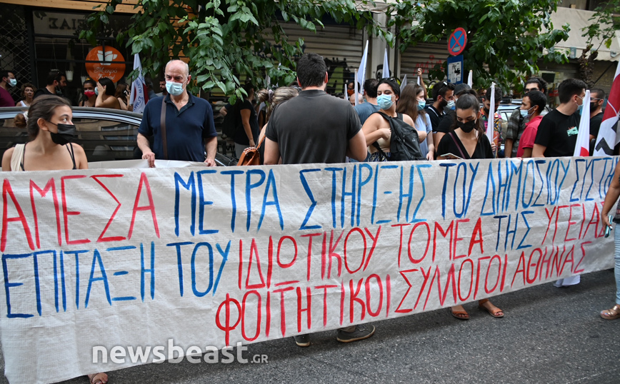 Οι συγκεντρωμένοι ζητούν ενίσχυση του δημόσιου συστήματος Υγείας, επίταξη του ιδιωτικού τομέα της υγείας και μέτρα προστασίας στους χώρους εργασίας.