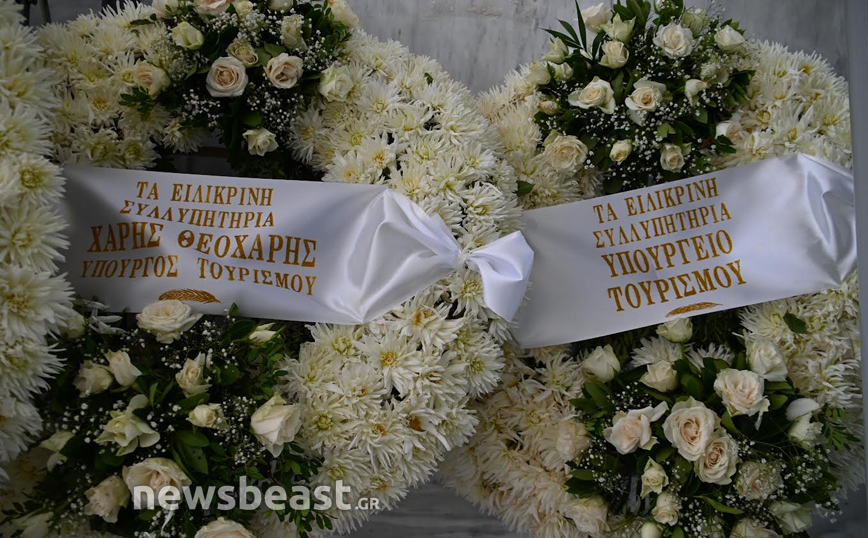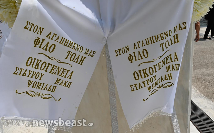 Στεφάνια για τον Τόλη Βοσκόπουλο που υπήρξε ένας από τους μεγαλύτερους καλλιτέχνες στην ιστορία του ελληνικού τραγουδιού έστειλαν ο πρωθυπουργός Κυριάκος Μητσοτάκης, ο υπουργός Τουρισμού Χάρης Θεοχάρης αλλά και φίλοι της οικογένειας του τραγουδιστή.