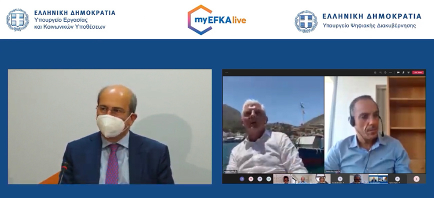 Κατά τη διάρκεια της παρουσίασης, οι δυο υπουργοί συνομίλησαν μέσω βιντεοκλήσης με 6 εκπαιδευμένους υπαλλήλους του ΕΦΚΑ- χειριστές της υπηρεσίας myEFKAlive- σε Ρόδο, Τήνο, Σύρο, Κάλυμνο, Νάξο και Κάρπαθο αντίστοιχα.