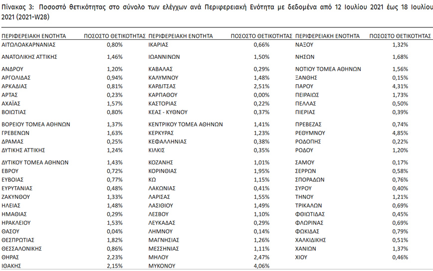 Συγκεκριμένα την εβδομάδα 12 Ιουλίου 2021 – 18 Ιουλίου 2021το ποσοστό θετικότητας ήταν 3,41% σε σύνολο 512.794 εργαστηριακών ελέγχων (RT-PCR/Rapid-Ag) και 0,81% σε σύνολο 1.008.857 αυτοδιαγνωστικών ελέγχων.