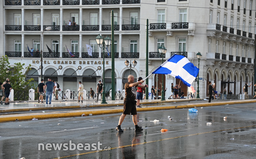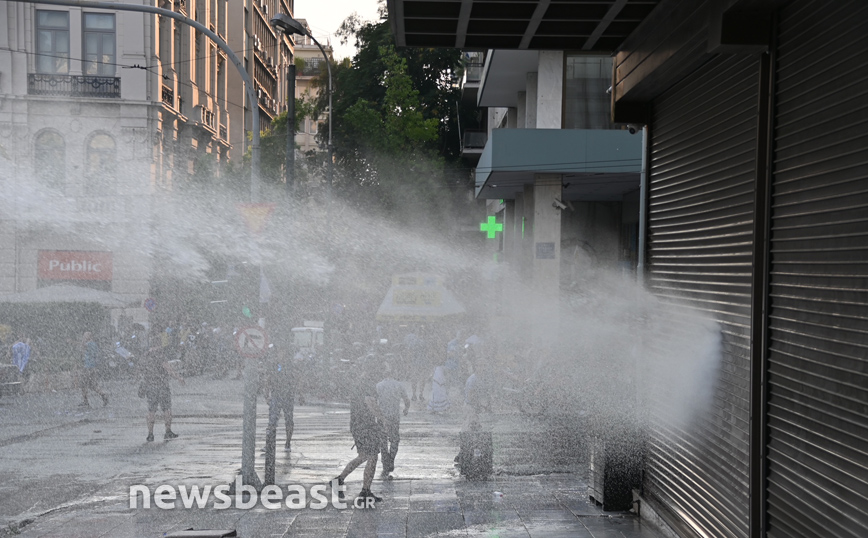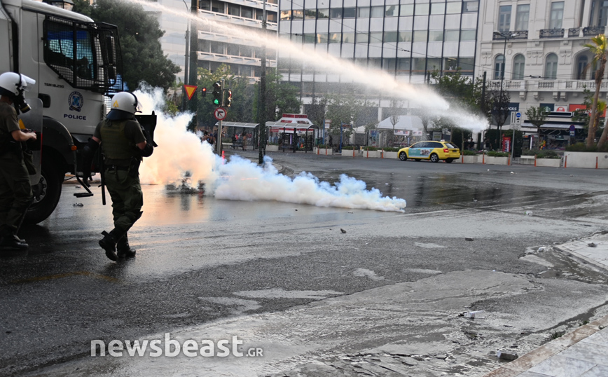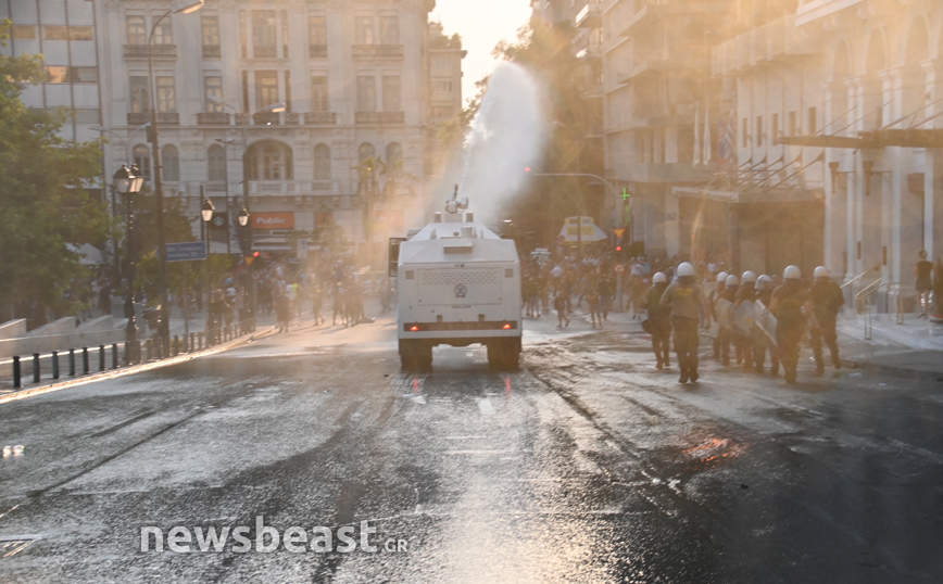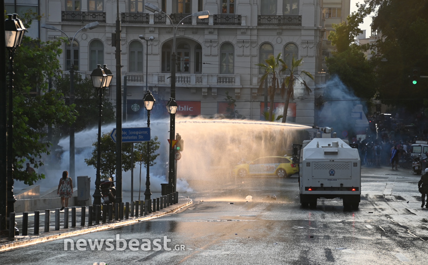 Οι αστυνομικοί κυνήγησαν στην Ερμού ορισμένους από τους διαδηλωτές, με την «Αύρα» της αστυνομίας να επιχειρεί σε εκείνο το σημείο κάνοντας ρίψεις νερού.