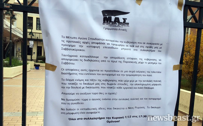 Το πρωί της Παρασκευής οι φοιτητές βρήκαν κλειστές τις πόρτες της σχολής, καταγγέλλουν την «απαράδεκτη απόφαση της κυβέρνησης» και κάνουν λόγο για «αυταρχισμό» και «τρομοκράτηση του λαού».