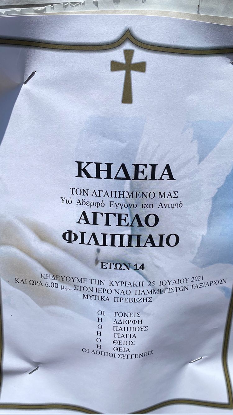 Ο Άγγελος έχασε τη ζωή του σε τροχαίο που σημειώθηκε το μεσημέρι του Σαββάτου στην Πρέβεζα. Το αγόρι επέβαινε σε μοτοσυκλέτα την οποία οδηγούσε συγγενικό του πρόσωπο και η οποία κάτω από αδιευκρίνιστες μέχρι στιγμής συνθήκες, προσέκρουσε σε μάντρα, με αποτέλεσμα ο 14χρονος να τραυματιστεί θανάσιμα.