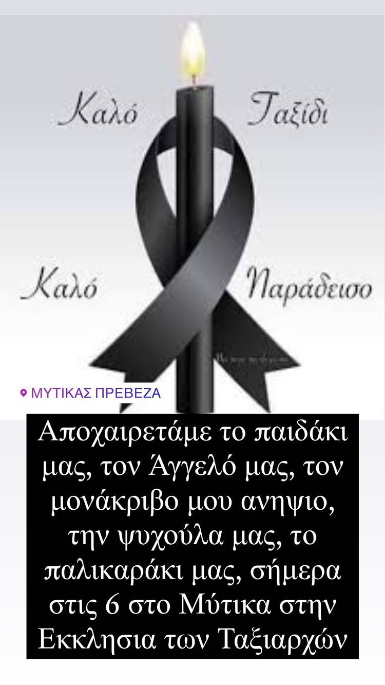 «Αποχαιρετάμε το παιδάκι μας, τον Άγγελο μας, τον μονάκριβό μου ανιψιό, την ψυχούλα μας, το παλικάρι μας, σήμερα στις 6 στο Μύτικα στην Εκκλησία των Ταξιαρχών», έγραψε η δημοσιογράφος.