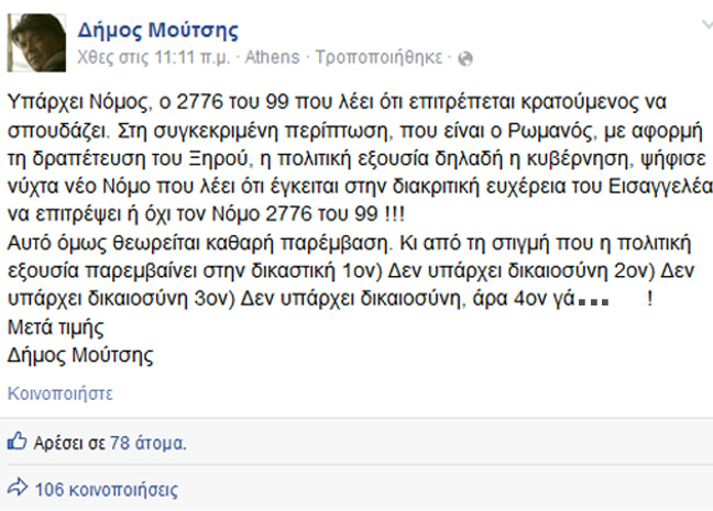 Την άποψη του για τα όσα συμβαίνουν με τον Νίκο Ρωμανό και τη στάση της Δικαιοσύνης προς το αίτημα του απεργού πείνας να παρακολουθήσει τα μαθήματα στο ΤΕΙ που έχει περάσει, κατέθεσε ο Δήμος Μούτσης γράφοντας πως «δεν υπάρχει δικαιοσύνη… γ…σέ τα».