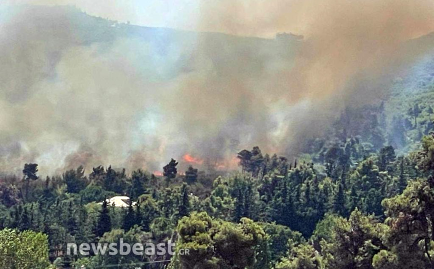 Η φωτιά αυτή τη στιγμή καίει ανεξέλεγκτη και το μέτωπο της πυρκαγιάς κατευθύνεται προς τον Διόνυσο και τη Δροσιά, σύμφωνα με το όσα είπε στο Newsbeast ο δήμαρχος Σταμάτας.
