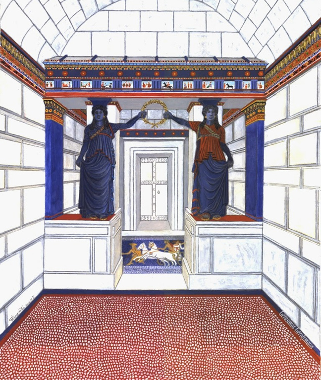 Μια πλήρης έγχρωμη αναπαράσταση της πύλης των Καρυάτιδων της Αμφίπολης δια χειρός Γεράσιμου Γερολυμάτου, κλέβει τις εντυπώσεις.