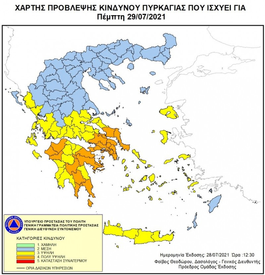 Πολύ υψηλός είναι ο κίνδυνος πυρκαγιάς για αύριο Πέμπτη 29 Ιουλίου σύμφωνα με τον Χάρτη Πρόβλεψης Κινδύνου Πυρκαγιάς που εκδίδει η Γενική Γραμματεία Πολιτικής Προστασίας του υπουργείου Προστασίας του Πολίτη.