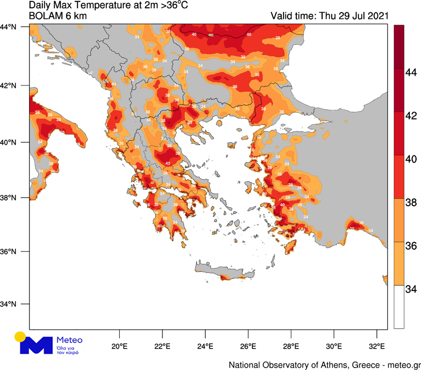 Αναφορικά με τον καιρό της Πέμπτης 29/07, οι μέγιστες θερμοκρασίες σε πολλές περιοχές θα ξεπεράσουν τους 39 βαθμούς, ενώ οι απολύτως μέγιστες θα φτάσουν τοπικά στα ηπειρωτικά στους 42-43 βαθμούς, στο Ιόνιο τους 39-40 βαθμούς και στο Ανατολικό Αιγαίο τους 39-41 βαθμούς Κελσίου.
