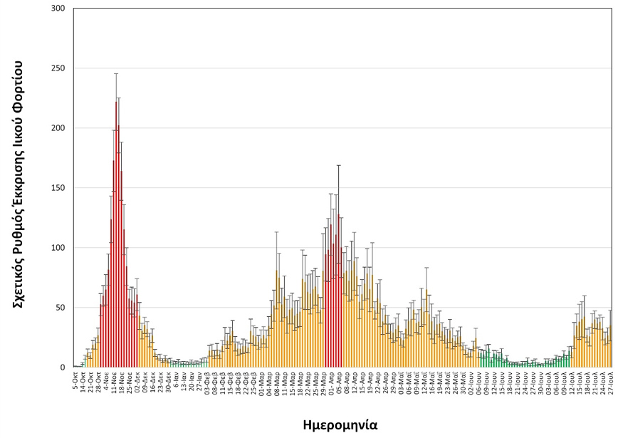 Συγκριτικά, στα δείγματα που λαμβάνονται καθημερινά στην είσοδο της Εγκατάστασης Επεξεργασίας Λυμάτων Θεσσαλονίκης, αναφορικά με τις εξορθολογισμένες τιμές σχετικής έκκρισης ιικού φορτίου, η μέση τιμή των δύο πιο πρόσφατων μετρήσεων, δηλαδή της Δευτέρας 26/7 και της Τρίτης 27/7 είναι: