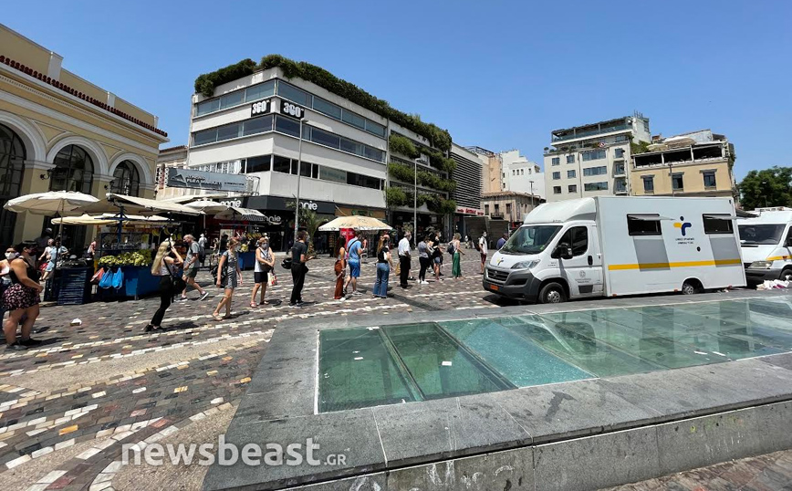 Κύμα καύσωνα πλήττει τη χώρα, με τις θερμοκρασίες να χτυπούν κόκκινο, ωστόσο αρκετοί πολίτες περιμένουν στην ουρά στο Μοναστηράκι για να κάνουν rapid tests.