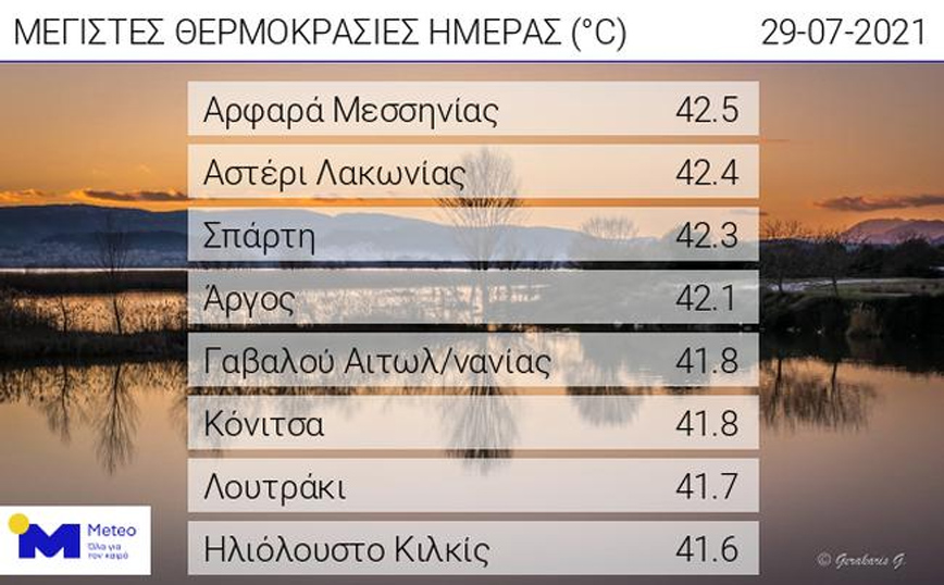 Ιδιαίτερα υψηλές θερμοκρασίες επικράτησαν την Πέμπτη 29/07 σε ολόκληρη τη χώρα. Με εξαίρεση τις Κυκλάδες και τα νησιά του Βορείου Αιγαίου, σε όλα τα υπόλοιπα γεωγραφικά διαμερίσματα της χώρας ο υδράργυρος ξεπέρασε σε κάποιον μετεωρολογικό σταθμό τους 40 βαθμούς Κελσίου, όπως καταγράφηκε από 63 σταθμούς του Εθνικού Αστεροσκοπείου Αθηνών/meteo.gr.