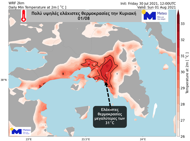 Ας σημειωθεί ότι οι ελάχιστες θερμοκρασίες την Κυριακή εντός του αστικού ιστού της Αθήνας αναμένεται να κυμανθούν στους 30-32 βαθμούς Κελσίου.
