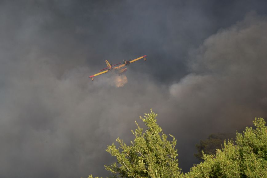 Συγκεκριμένα, δύο πυροσβεστικά αεροσκάφη και τέσσερα ελικόπτερα πραγματοποιούν συνεχείς ρίψεις.