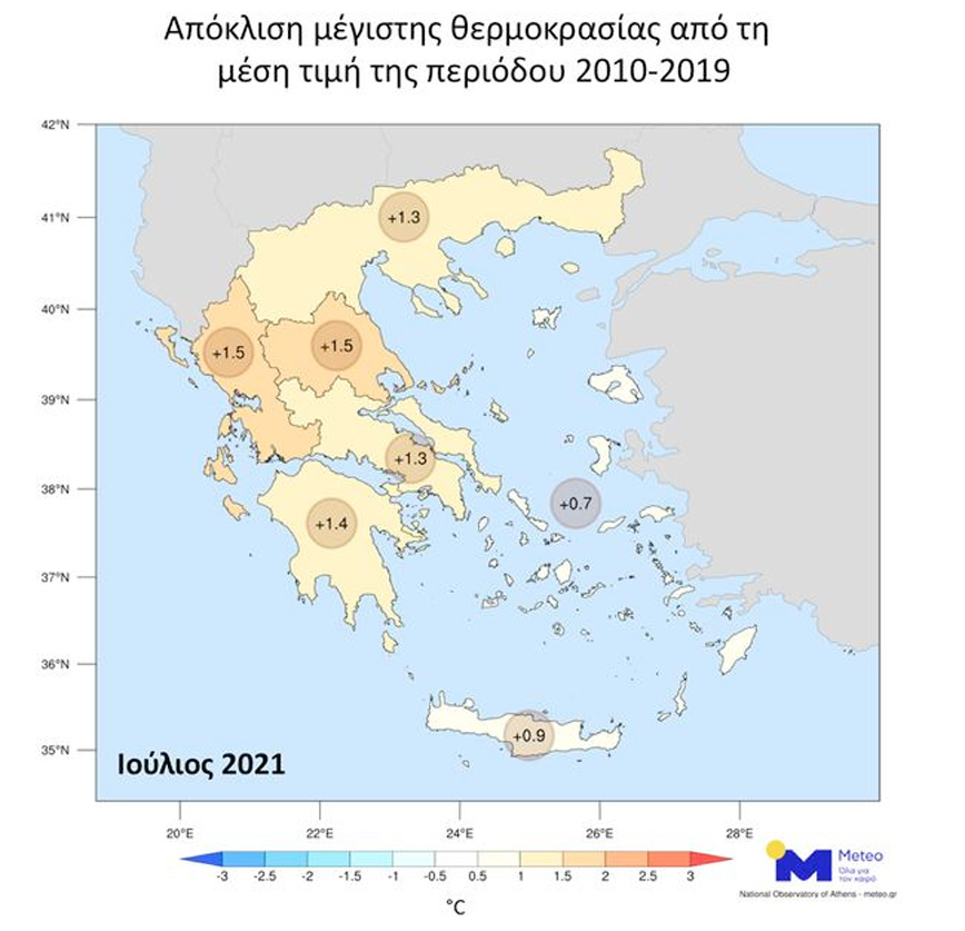 Σε όλα τα γεωγραφικά διαμερίσματα της Ελλάδας οι μετεωρολογικοί σταθμοί του Εθνικού Αστεροσκοπείου Αθηνών/meteo.gr κατέγραψαν φέτος τιμές θερμοκρασίας πάνω από τον μέσο όρο της περιόδου 2010-2019 για τον μήνα Ιούλιο.