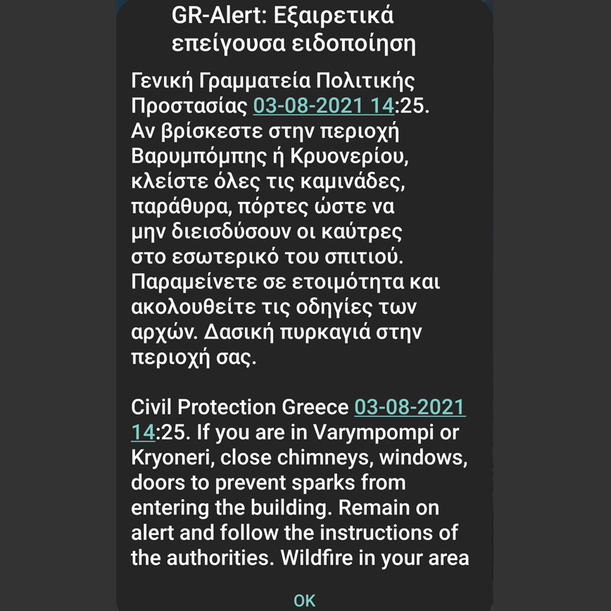 Σχετικό μήνυμα εστάλη από την Υπηρεσία του «112», καλώντας τους κατοίκους Βαρυμπόμπης και Κρυονερίου να κλείσουν τις καμινάδες, τα παράθυρα και τις πόρτες των σπιτιών ώστε να μην μπουν οι καύτρες στο εσωτερικό.