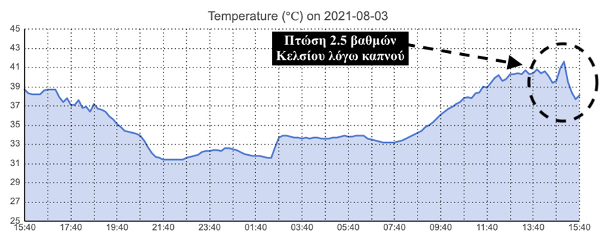 Σύμφωνα με το Meteo ο καπνός από τη φωτιά προκάλεσε πτώση 2,5 βαθμών στην περιοχή, γύρω στις 14:00, όπως θα δείτε και στο παρακάτω γράφημα.