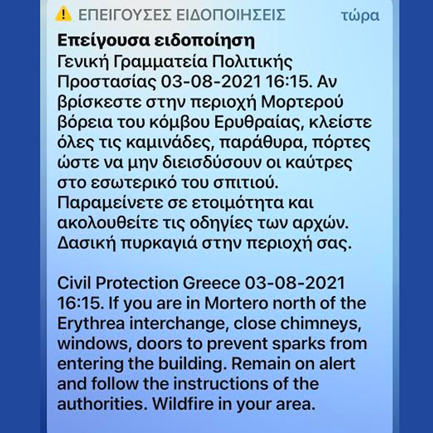 «Επείγουσα ειδοποίηση Γενική Γραμματεία Πολιτικής Προστασίας 03-08-2021, 14.25. Αν βρίσκεστε στην περιοχή Μορτερού βόρεια του κόμβου Ερυθραίας, κλείστε όλες τις καμινάδες, παράθυρα, πόρτες ώστε να μην διεισδύσουν οι καύτρες στο εσωτερικό του σπιτιού.