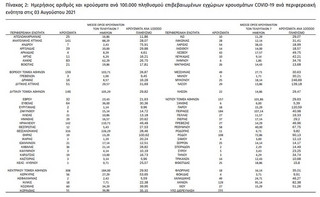 Ο ΕΟΔΥ ανακοίνωσε σήμερα (3/8) 3.428 νέα κρούσματα κορονοϊού στην Ελλάδα με τα περισσότερα να καταγράφονται στην Αττική. Στο λεκανοπέδιο, συγκεκριμένα, εντοπίστηκαν 1.168 νέα περιστατικά του ιού, τα οποία κατανέμονται ως εξής: