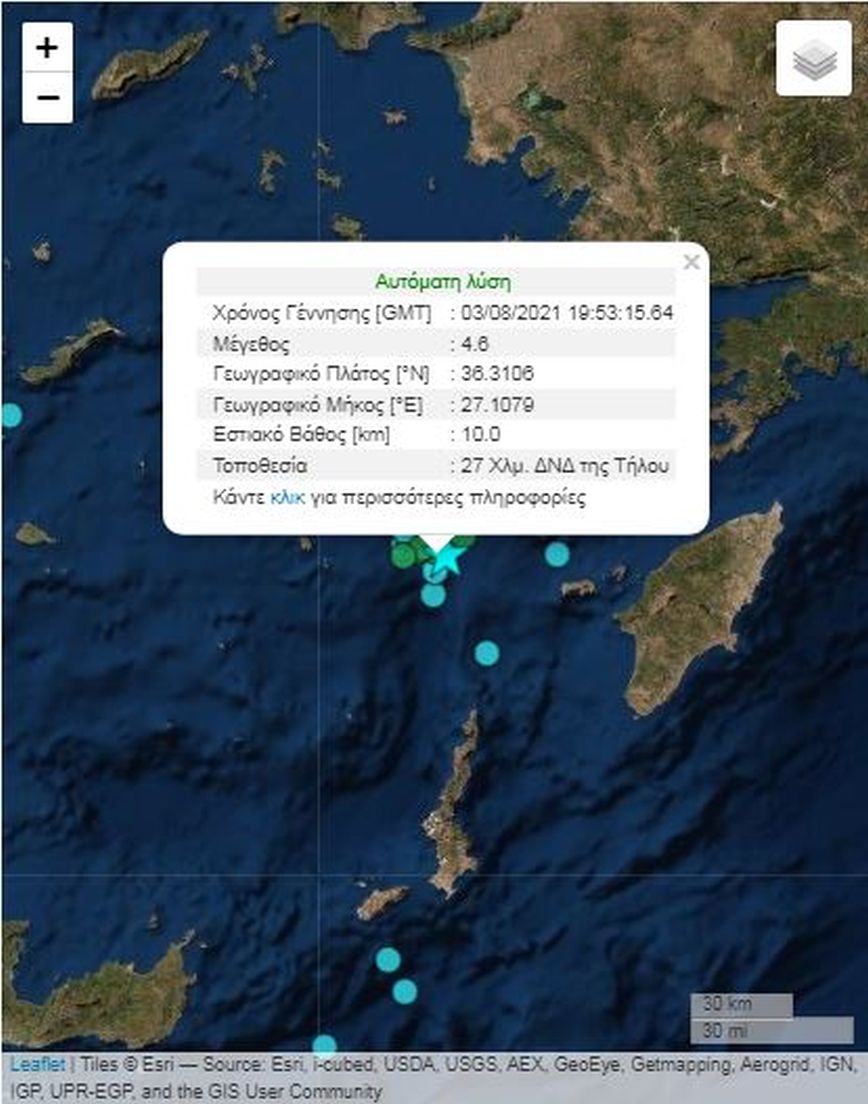 Σεισμός σημειώθηκε πριν λίγα λεπτά «ανοιχτά» της Τήλου. Ο σεισμός είχε μέγεθος 4,6 βαθμών της Κλίμακας Ρίχτερ.