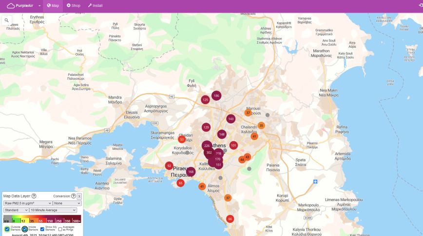 Τα στοιχεία προέρχονται από την ευρωπαϊκή πλατφόρμα μετρήσεων ποιότητας αέρα PurpleAir: Real-time Air Quality Monitoring που στηρίζεται στη νέα γενιά αισθητήρων του Διαδικτύου των Πραγμάτων. Οι μονάδες είναι σε μικρογραμμάρια ανά κυβικό μέτρο και οι τιμές που εμφανίζονται, είναι αβαθμονόμητες και πρέπει να διαιρεθούν με έναν παράγοντα 1.8 περίπου.