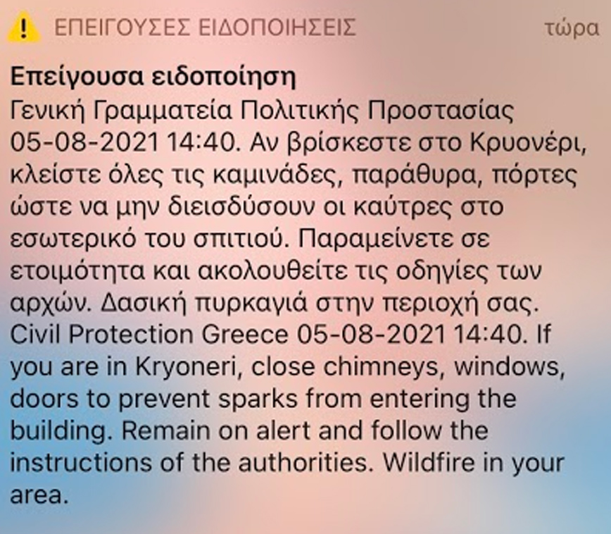 «Αν βρίσκεστε στο Κρυονέρι, κλείστε όλες τις καμινάδες, παράθυρα, πόρτες ώστε να μην διεισδύσουν οι καύτρες στο εσωτερικό του σπιτιού» αναφέρεται στην ειδοποίηση έκτακτης ανάγκης.