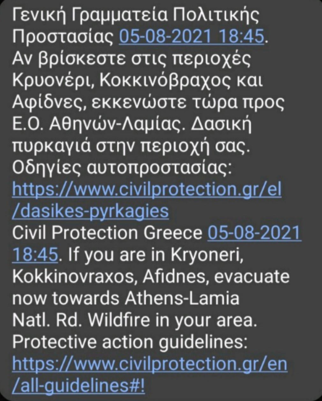 «Εκκενώστε τώρα προς Εθνικό Οδό Αθηνών Λαμίας» αναφέρει το SMS