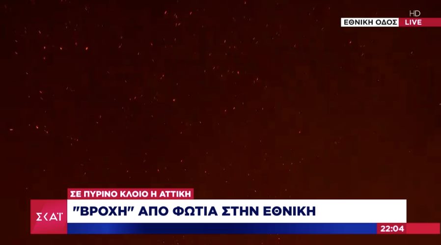 Στην πρώτη από τις δύο εικόνες – προερχόμενη από το δελτίο ειδήσεων του ΣΚΑΪ νωρίτερα σήμερα – είναι ορατό πως στο μέτωπο της Αττικής «‘βρέχει’ καύτες», παρατηρεί: