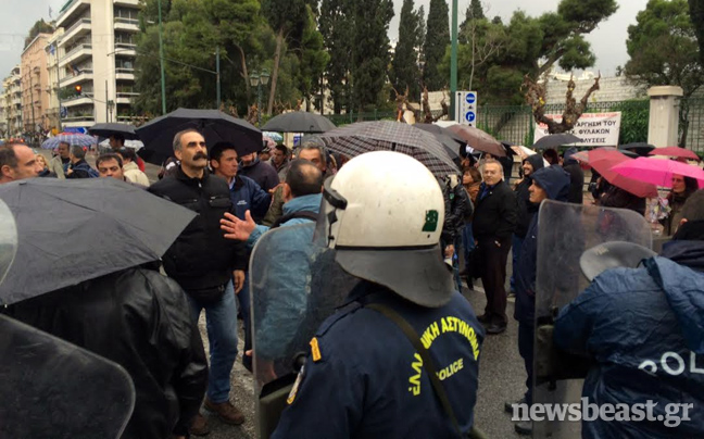 Ένταση επικράτησε για λίγα λεπτά έξω από το υπουργείο Διοικητικής Μεταρρύθμισης, όπου πραγματοποιούν συγκέντρωση διαμαρτυρίας περίπου 250 σχολικοί φύλακες, οι οποίοι ζητούν την επιστροφή τους στις θέσεις τους και την επανασύσταση του θεσμού του σχολικού φύλακα.