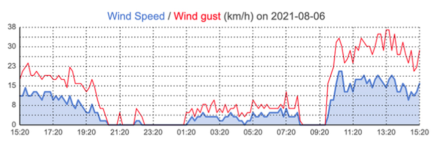 Η εξέλιξη του ανέμου τις τελευταίες ώρες στον σταθμό του Εθνικού Αστεροσκοπείου Αθηνών/meteo.gr στην Μαλακάσα, Αττικής