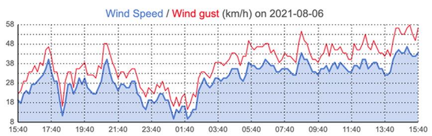 Ενδεικτικά, οι μέγιστες ριπές ανέμου που έχουν καταγραφεί στο δίκτυο αυτόματων μετεωρολογικών σταθμών του Εθνικού Αστεροσκοπείου Αθηνών/meteo.gr, πλησιάζουν τοπικά τα 60 – 70 χιλιόμετρα την ώρα κυρίως στα ανατολικά και νότια τμήματα.