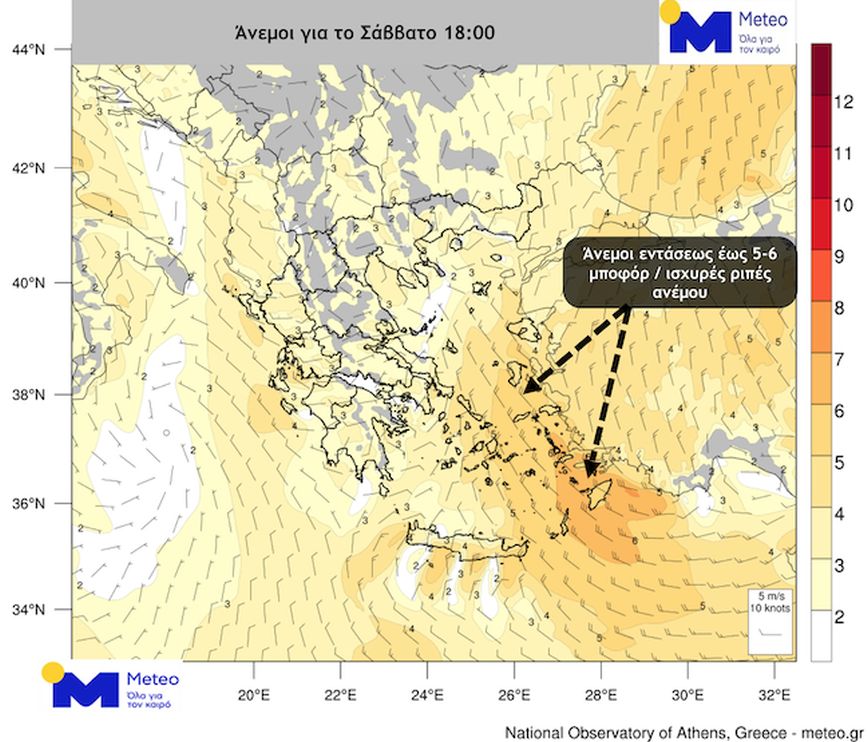 Οι άνεμοι στο ανατολικό Αιγαίο θα πνέουν με εντάσεις έως 5-6 μποφόρ. Πολύ υψηλός διατηρείται και ο κίνδυνος εκδήλωσης και εξάπλωσης δασικών πυρκαγιών κυρίως στα ανατολικά και νότια νησιωτικά τμήματα.