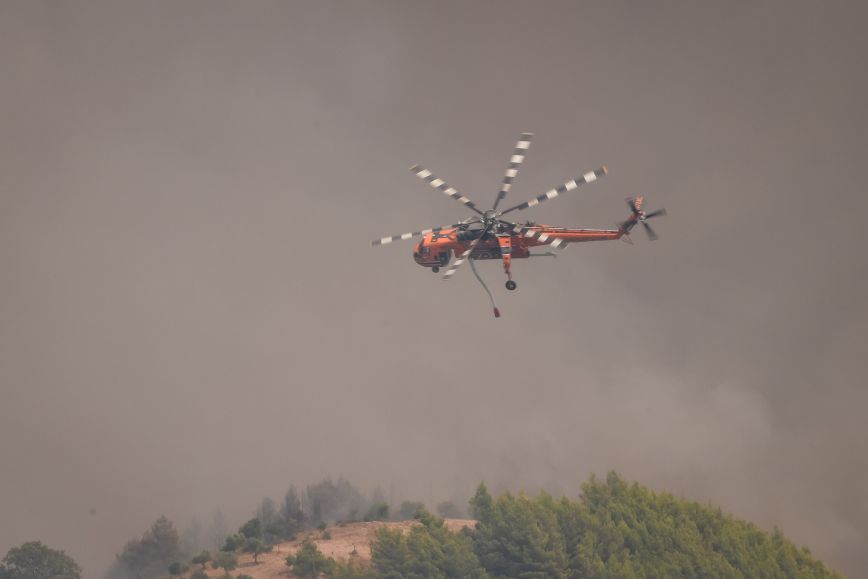 Με το πρώτο φως της ημέρας, άρχισαν να κάνουν ρίψεις νερού δύο πυροσβεστικά αεροσκάφη κι ένα ελικόπτερο.