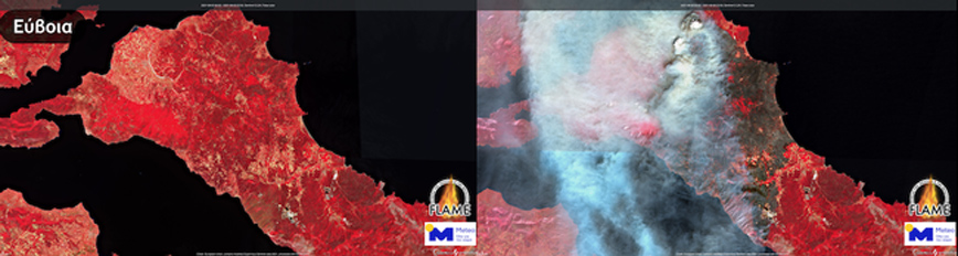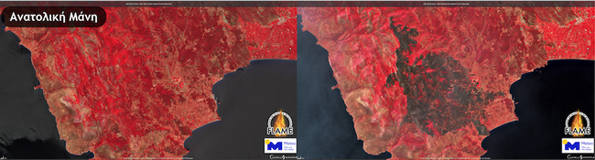 Νέες δορυφορικές εικόνες από τις φωτιές που έκαψαν την Εύβοια, τους πρόποδες της Πάρνηθας και την Ανατολική Μάνη.